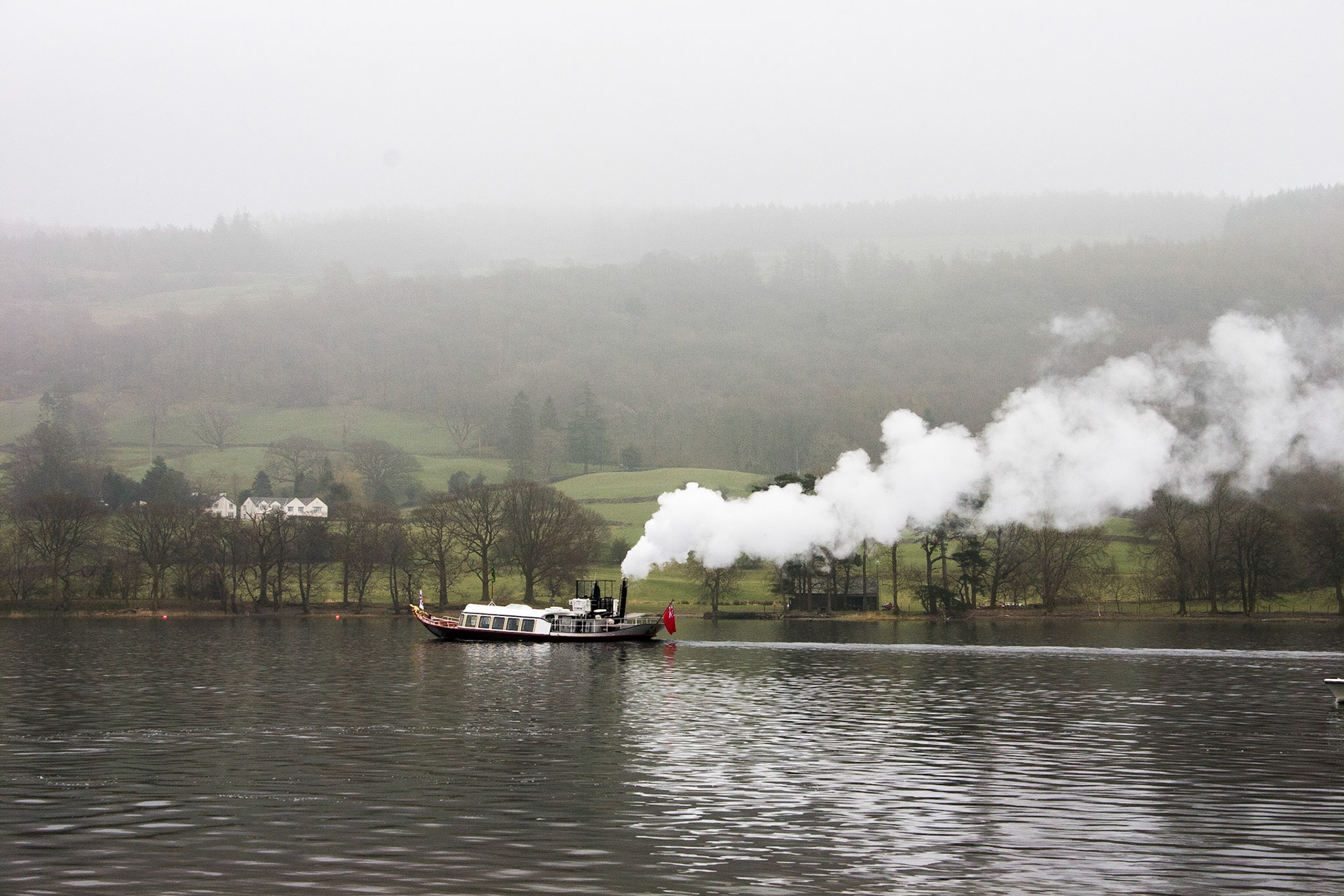 The steam ferry 'Gondola' winds its way away from the Lake Road jetty on Coniston lake the English Lake District on a typical misty lakeland winter's day. Launched in 1859 to serve the passengers of the then new Furness Railway.
