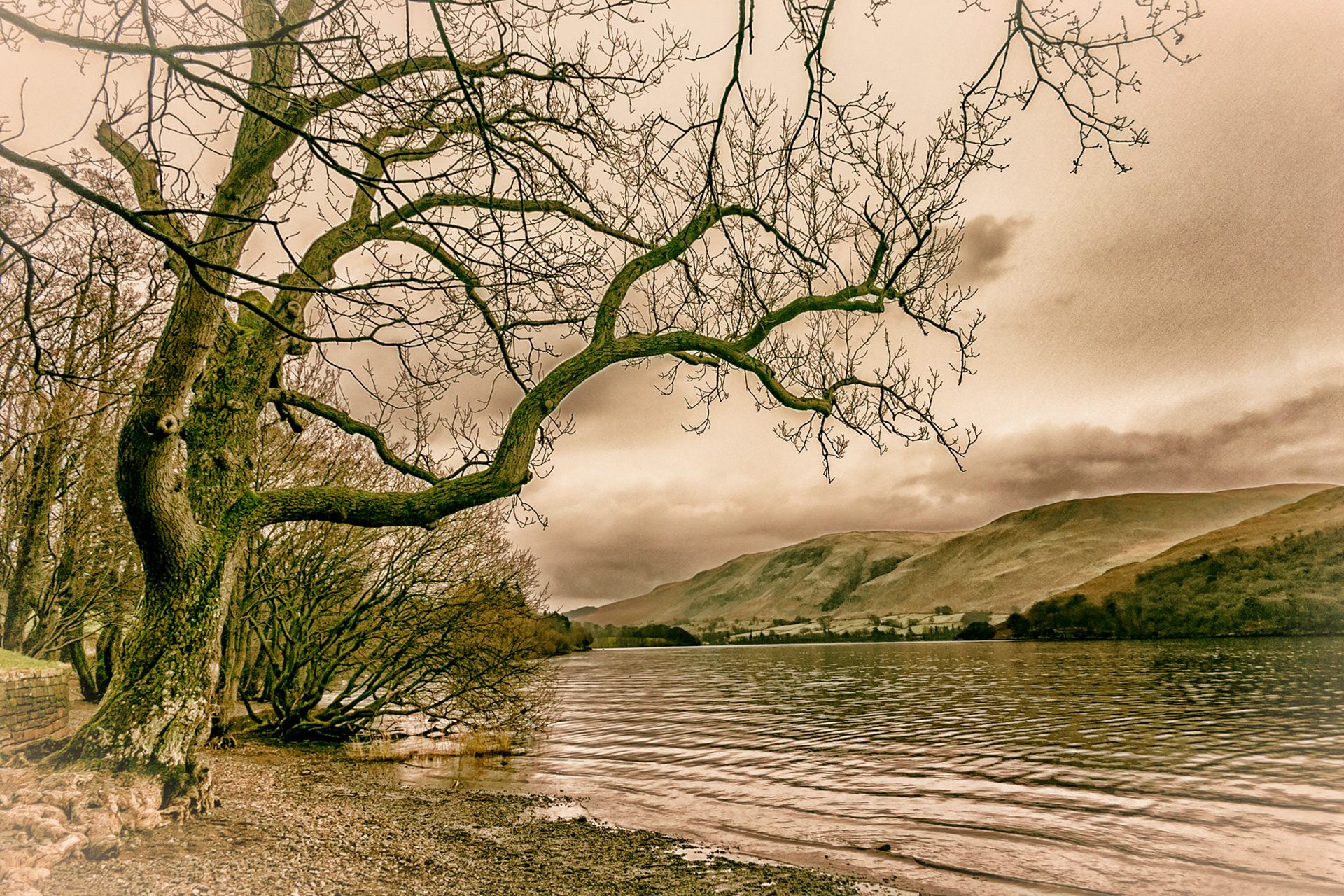 A toned image portraying the western edge of Buttermere lake in the English Lake District. The 2417 feet mountain Robinson is lurking in the mist beyond on this typical misty but still beautiful Lakeland day.