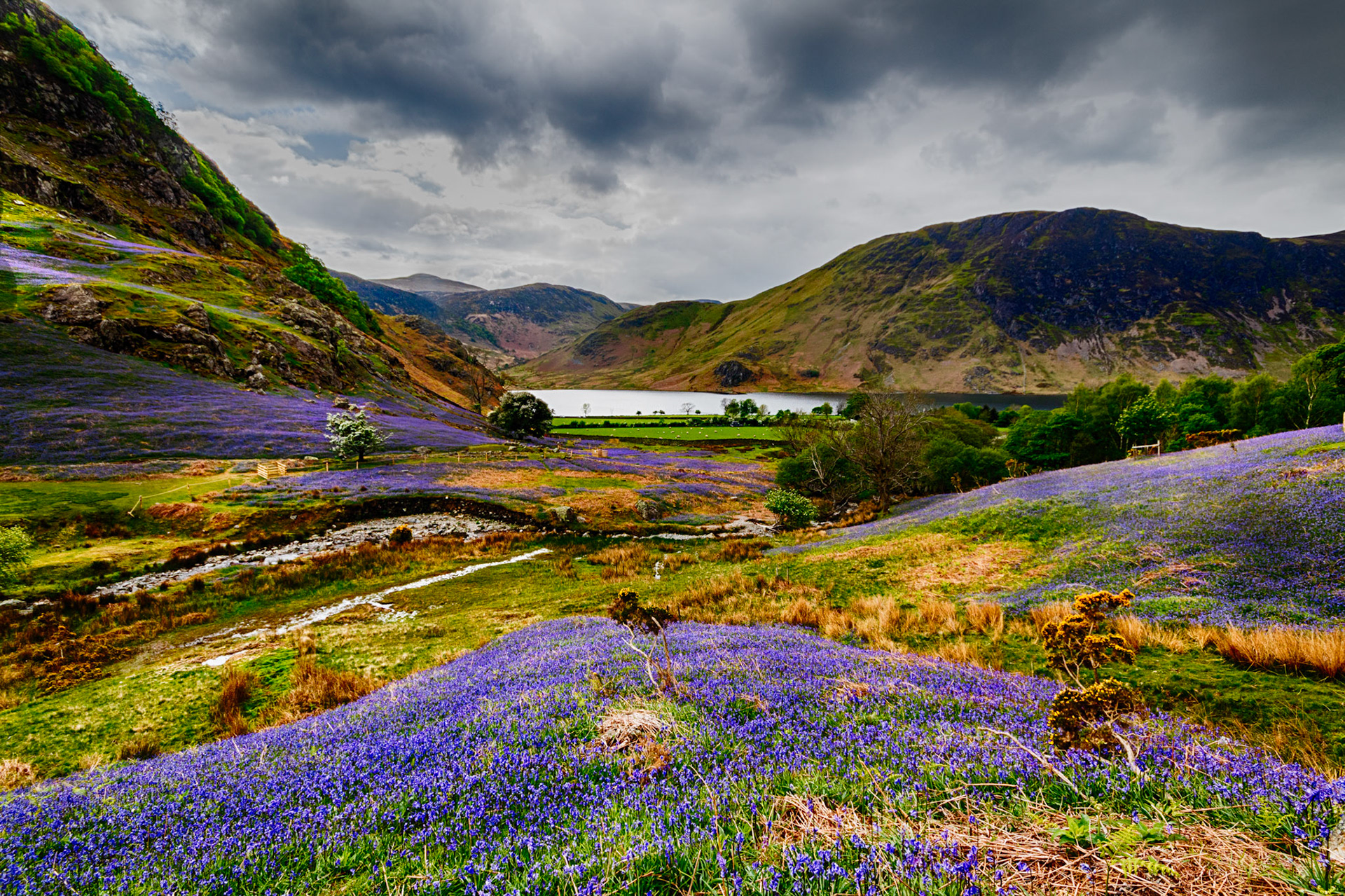 Rannerdale, a side valley running into Crummock Water in the English Lake District, offers up a spectacular bluebell display in May each year. This picture shows the confluence of Rannerdale Beck, left, with Squat Beck and the edge of the bluebells in the top right.