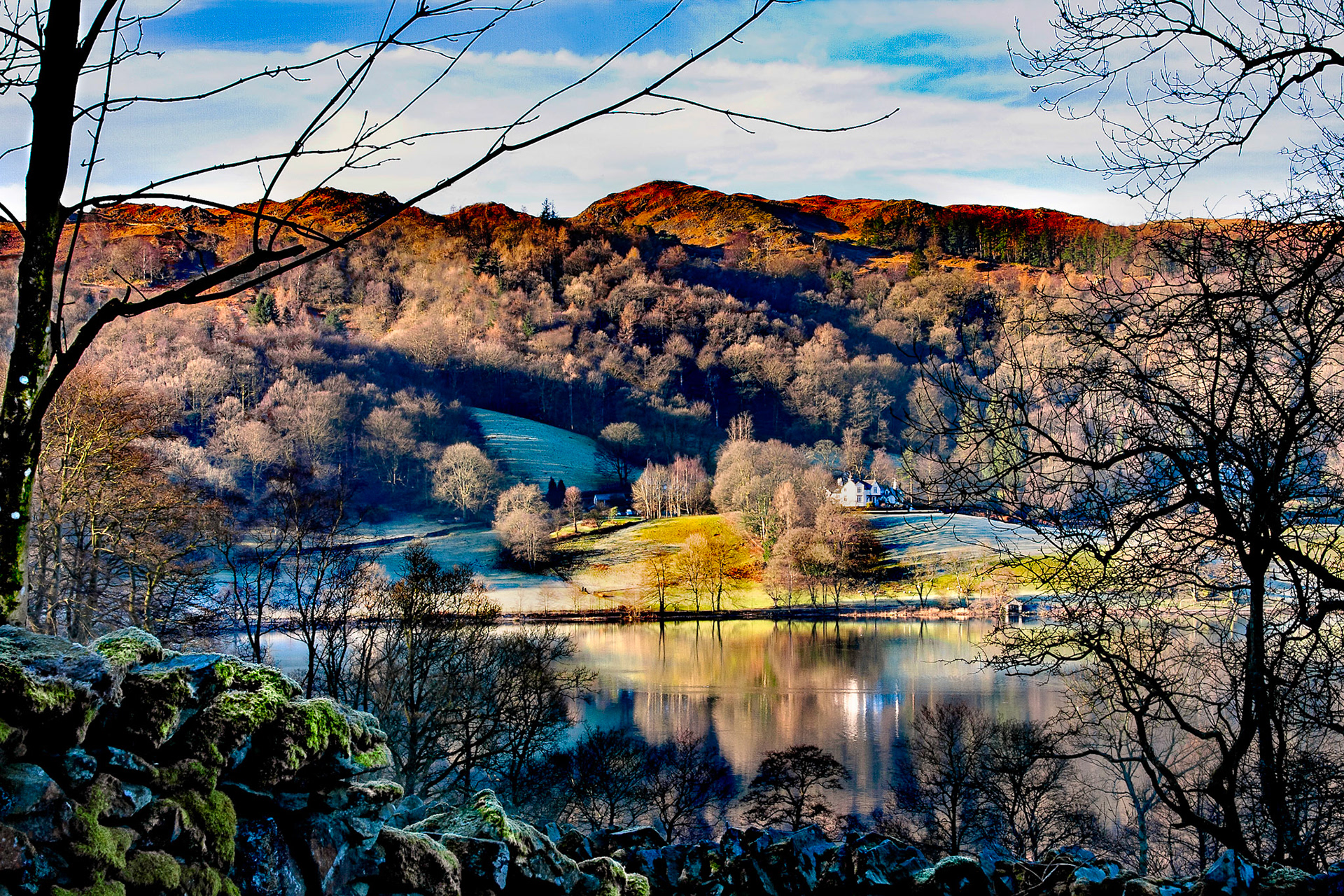 Low clouds roll over lake districts peaks.
